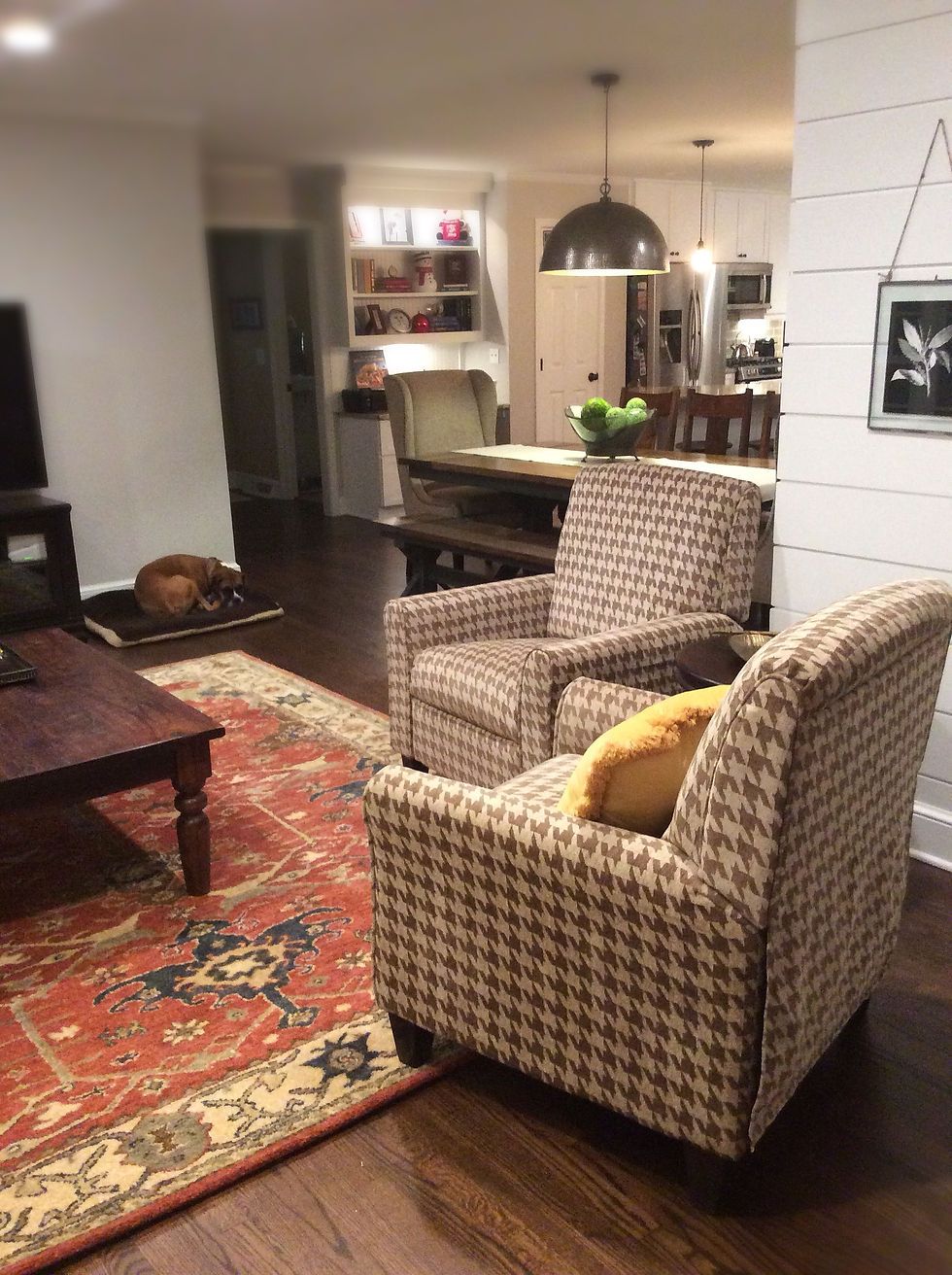 A warm ranch-style home greeted me as I pulled up. The owners had already updated the floors with a warm walnut floors, and renovated the farmhouse modern kitchen. They were wanting to keep the comforting appeal with a hipster vibe. The furnishings and textiles were kept traditional. Next we layered in unexpected elements from the furniture arrangement, to the collected decor pieces, and custom built dining table. When design captures the family, you get to know them just walking around.