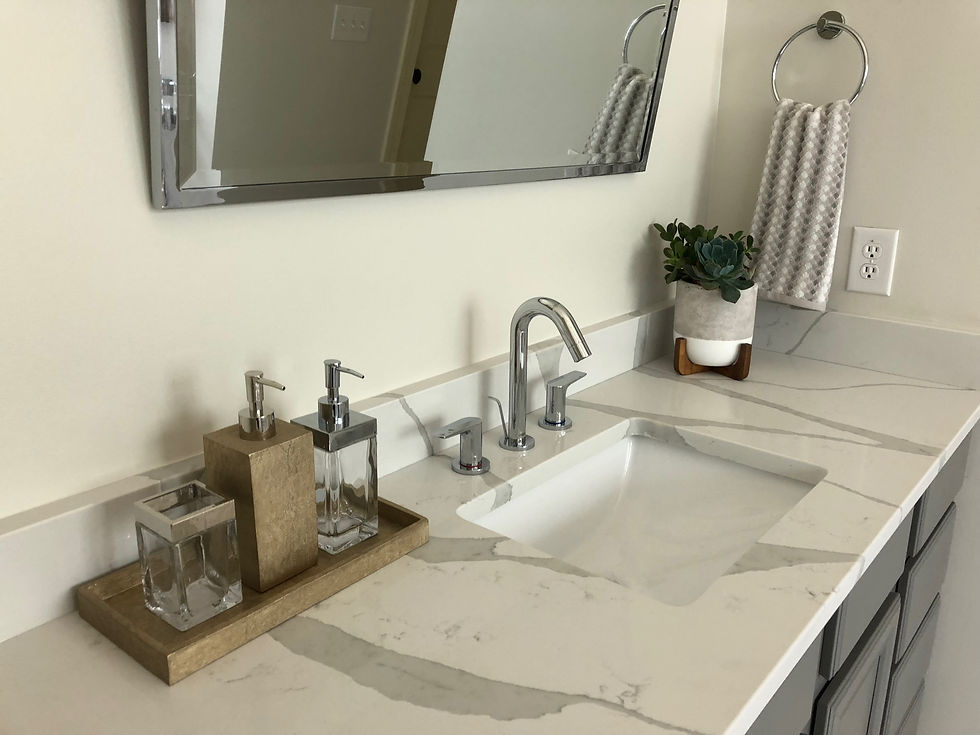 We worked this Master Bathroom from the floor to the ceiling. We chose a beautiful marble-look tile for the floor and shower walls. The hexagon tile inlay, a statement itself, immediately sets off the new free standing tub. We put a warm grey penny tile on the shower floor to compliment both patterns and act as a subtle texture on your feet. The walls and cabinets were painted. The subtle dreamy palette called for warm wood accents, and is finished off with polished nickel fixtures and accessories and lighting.